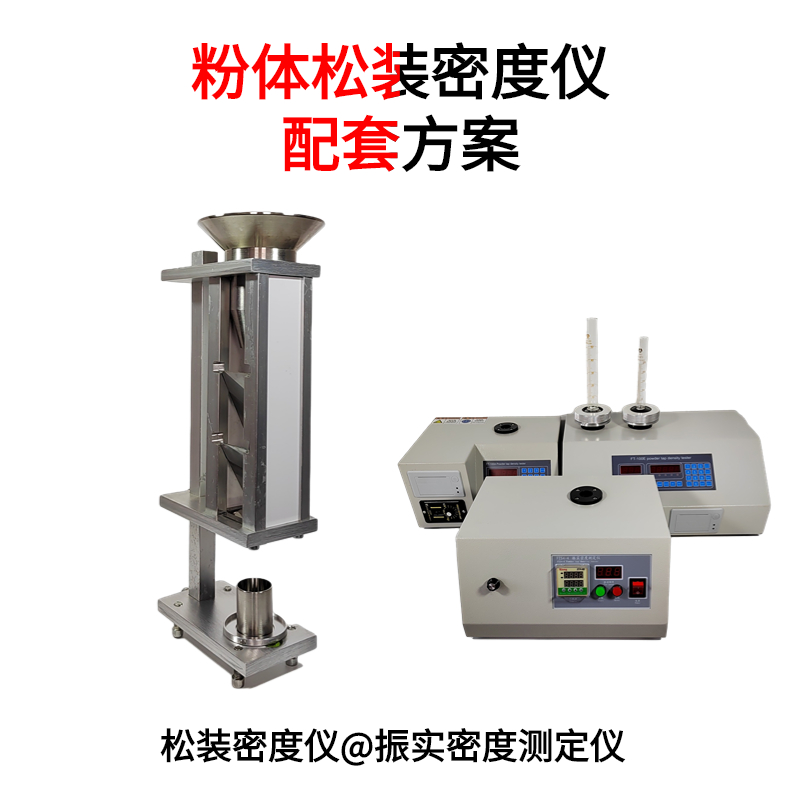 裝置 測定裝置(圖1)頂部為一個裝有1.0mm篩網(wǎng)的粉末漏斗。粉末漏斗下方依次是一個加料漏斗和一個裝有四塊玻璃擋板的擋板箱,待測粉末樣品通過加料漏斗進入擋板箱后,可沿擋板滑動和反*彈,降低下落沖力。擋板箱的底部為一個漏斗狀收集器,使粉末聚集并傾入收集器正下方具有特定容積的樣品接收杯里。樣品接收杯可為圓柱體(容積為25.00ml+0.05ml,內徑為30.00mm±2.00mm)或正方體(容積為16.39ml±0.20ml,內部邊長為25.400mm±0.076mm)。