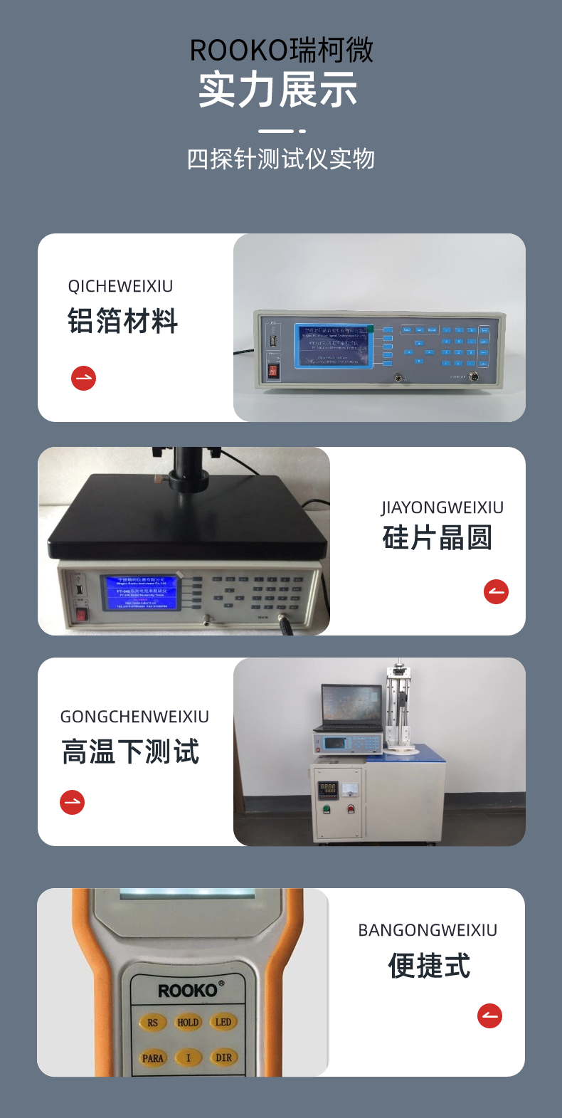 半導體電阻率測試儀是用于測量半導體材料電阻率、方塊電阻(薄層電阻)以及金屬薄層電阻的儀器。它根據四探針測試原理,可以用于片狀、棒狀等半導體材料的測量。這類測試儀具有測量精度高、范圍廣、穩定性好、結構緊湊、使用方便、價格低等特點。