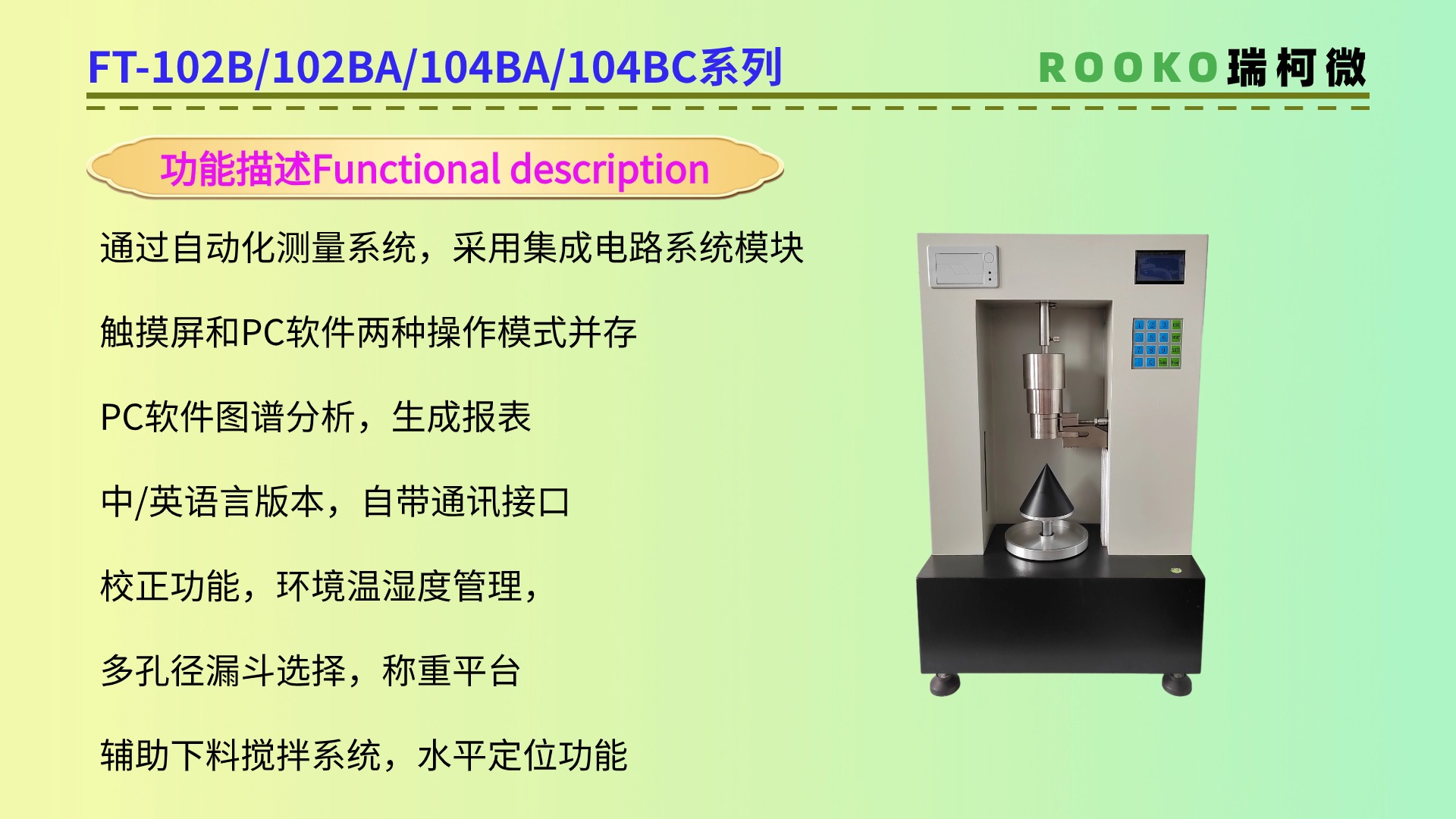 特點:休止角測定儀通常具有測量準確、操作簡便、重復性好等特點。此外,一些休止角測定儀還具有自動化測量、數據記錄和分析等功能FT-104BA