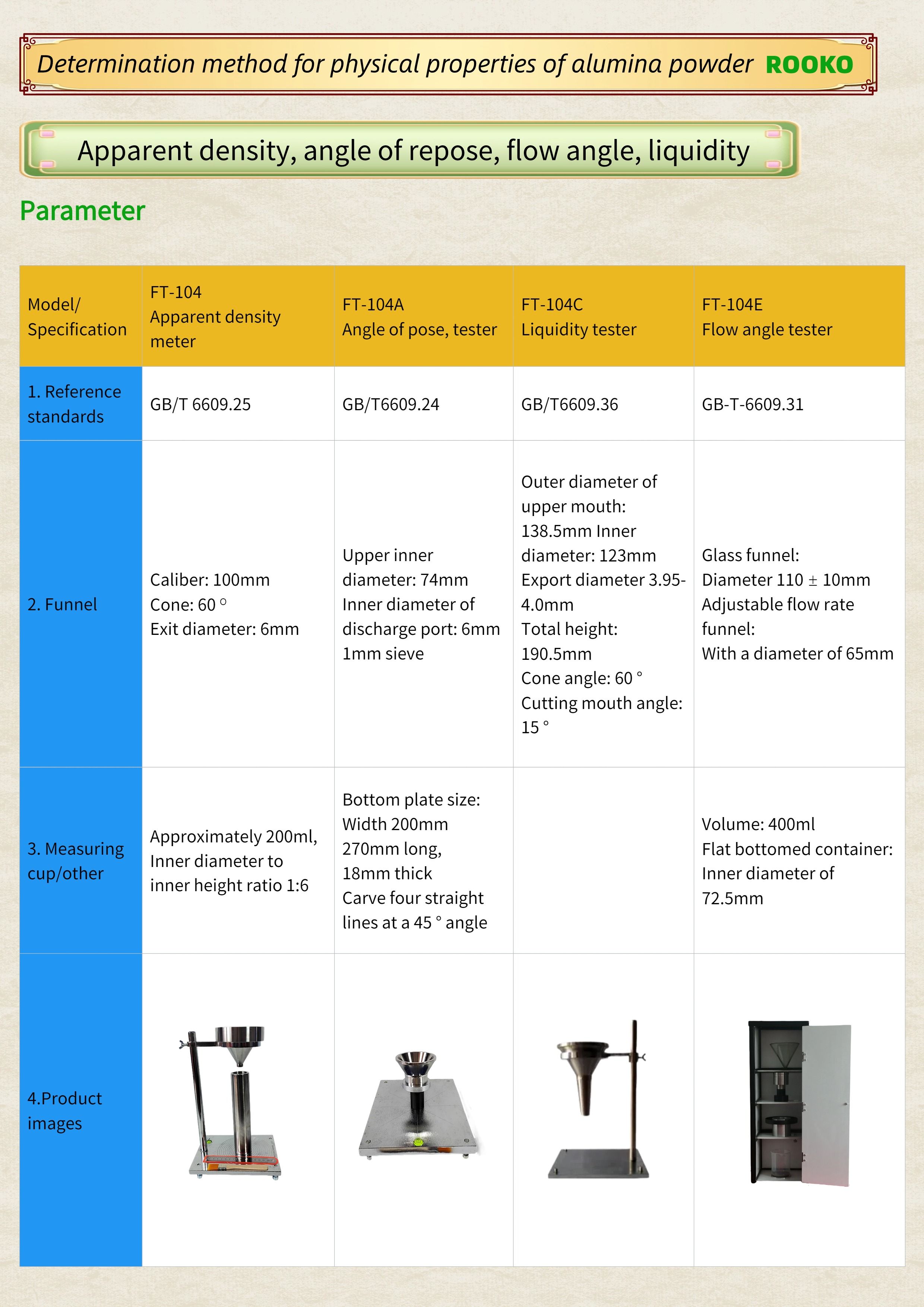 FT-104 104A 104C Apparent density, angle of repose, flow angle, liquidity